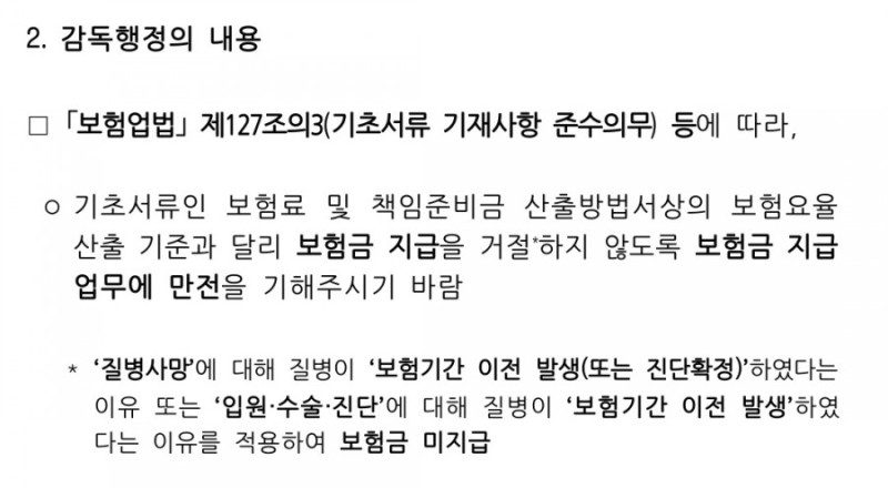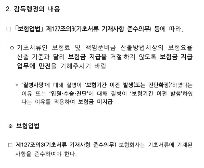 2. 보험업법 제127조의3(기초서류 기재사항 준수의무) 등에 따라 붙임을 참고하여 보험금 지급 업무시 유의하여 주시기 바랍니다.