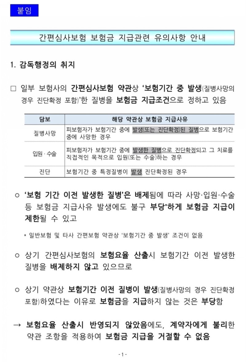 금융당국이 간편심사보험 약관에서 ‘보험기간 중 발생’한 질병을 보험금 지급조건으로 정해놓고, 보험기간 이전에 질병이 발생했다며 보험금을 지급하지 않은 일부 보험사에 대해 부당하다는 판단을 내렸기 때문이다.