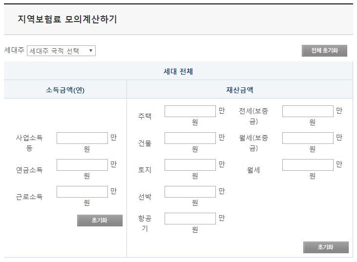 그렇다면 위에서 설명드린대로 지역보험료 모의계산하기 메뉴를 선택하신 후 국적, 소득금액, 자동차 관련 정보를 입력하시면 됩니다.