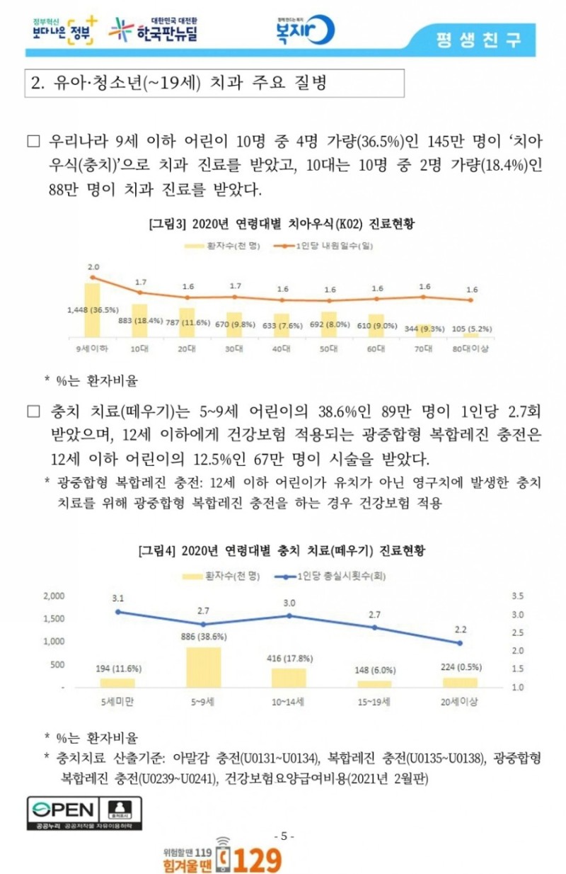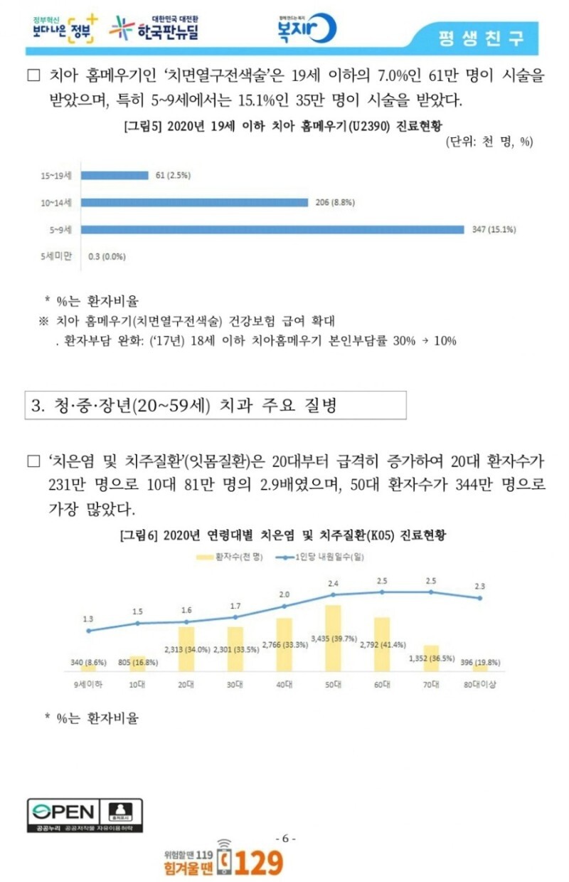 - (19세 이하) 치아 홈메우기는 19세 이하의 7.0%인 61만명 시술, 충치 떼우기는 5~9세의 38.6%인 89만명 시술