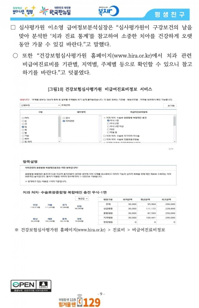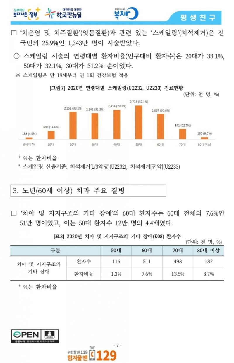 19세 이하는 치아 홈메우기와 충치 떼우기, 20세 이상은 스케일링, 65세 이상은 임플란트와 틀니를 주로 시술 받음