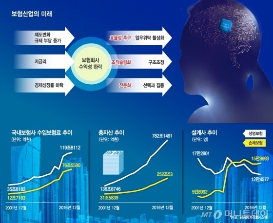 보험 판매조직뿐만 아니라 보험료와 보험사가 쌓아야 할 책임준비금을 계산하는 계리사, 보험 가입을 심사하는 언더라이터, 보험금 지급 업무까지 AI가 사람보다 더 정확하게 수행하며 보험사에서 사람이 담당하는 일은 크게 줄어들 전망이다.