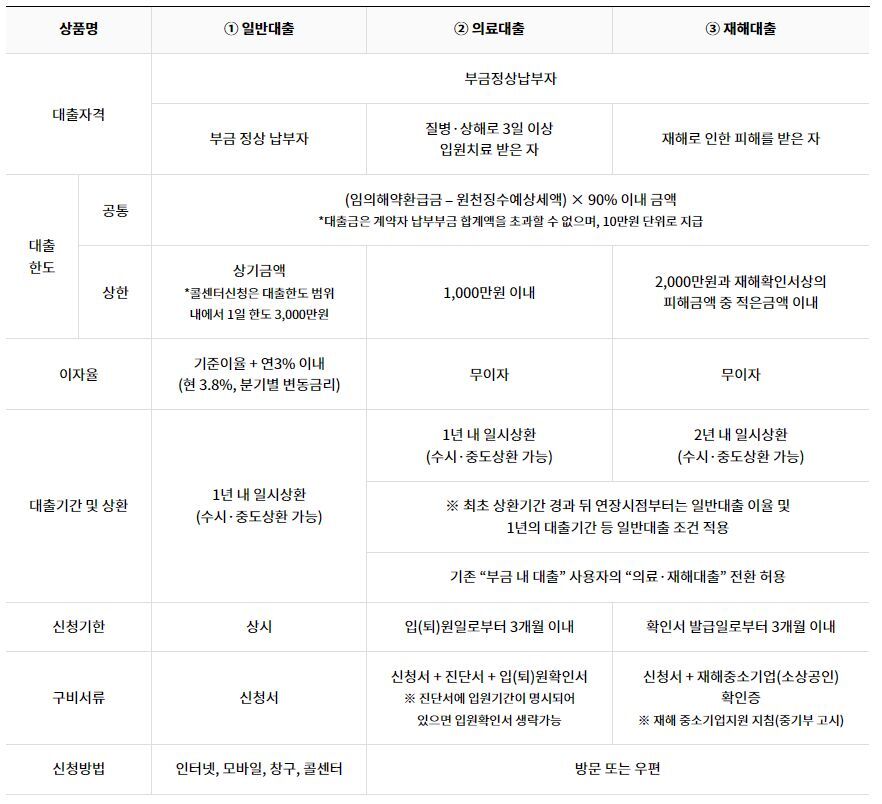 그리고 일반대출, 의료대출, 재해대출에 따라 한도가 조금씩 달라집니다.