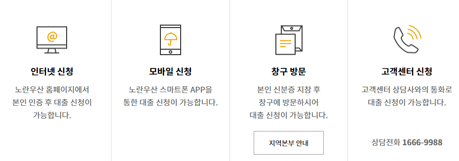 대출 신청방법은 인터넷, 모바일, 창구 방문, 고객센터 등을 통해 신청하실 수 있습니다.