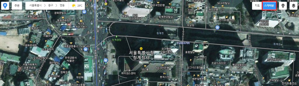 우측 상단에 스카이뷰라고 적혀있는 버튼이 있습니다. 이 버튼을 누르시면 2d지도가 위성지도로 변경됩니다. 말그대로 하늘에서 내려다본 실제 모습이라고 생각하시면 됩니다.