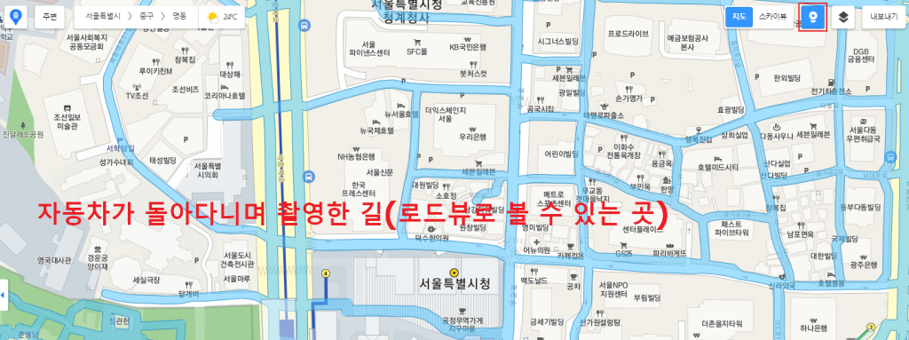 예를들어 서울시청을 보고싶으시다면 좌측 상단에 서울시청이라고 검색하시면 됩니다.