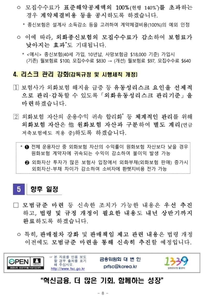 환위험 노출기간이 긴 외화 종신보험의 경우 설계사의 과도한 판매유인을 축소하고 실수요자 위주로 필요에 의해 가입할 수 있도록 모집수수료 한도를 합리적으로 조정하겠습니다.