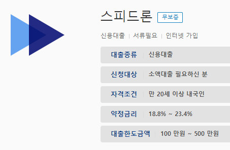 대출한도는 100만원~500만원이고, 대출금리는 연 18.8%~23.4% 입니다.