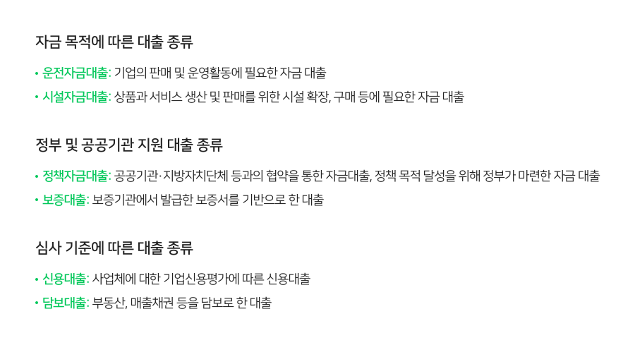 금융기관의 개인사업자 대출은 자금의 사용 목적, 정부 및 공공기관의 지원 여부에 따라 몇 가지 종류로 나눌 수 있는데요. 크게 ‘운전자금 대출’, ‘시설자금 대출’, ‘정책자금 대출’, ‘보증 대출’로 나눌 수 있고요. 대출에 대한 담보를 잡느냐 아니면 사업체의 신용만을 보고 대출을 해주느냐에 따라 ‘신용대출’과 ‘담보대출’로도 나눌 수 있습니다.