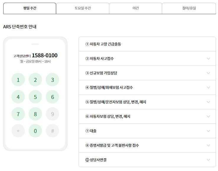 DB손해보험의 전화번호는 위와 같습니다. 이제 여러분들의 업무에 맞춰 전화를 하시면 되는데 아무때나 하시면 안됩니다. 상담원들이 상주해 있는 시간에 맞춰 전화를 해야 하는데요. 그럼 평일과 주말(공휴일)에 상담 가능한 시간은 언제인지 알려드리겠습니다.
