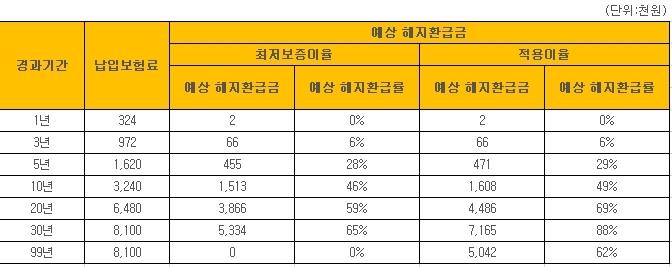 1년, 10년, 30년을 놓고 비교해봤을 때 1년에서 10년으로 늘어났을 때처럼 해지 환급률이 드라마틱하게 늘어나진 않았습니다. 아무래도 금액이 커진 것도 한 몫하지 않을까 하는 생각이 듭니다.