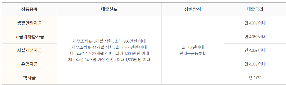 생활안정자금, 학자금, 고금리차환자금, 시설개선자금, 운영자금 대출한도는 최대 1,500만원 입니다.