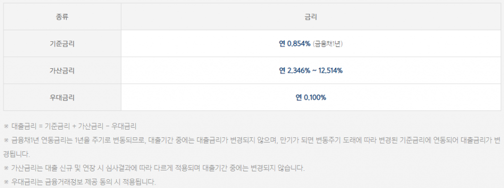 • 대출기간 – 3년~5년(원리금균등분할상환), 1년(만기일시상환)