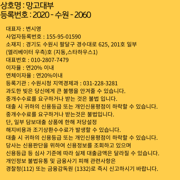 앞서 말씀드린 공식 등록업체 여부뿐만 아니라 따져보아야 할 것들은 많습니다. 먼저 제시하는 금리에 대해서 확인해야 합니다. 정식 등록업체에 해당한다면 제시하는 이율을 살펴보시고 법정 최고금리를 초과하는가 비교해 봐야 합니다. 약정을 보시면 금리를 표기하도록 되어 있으며, 법정 최고금리인 20%를 넘지 않는가 보시길 바랍니다. 해당 수치를 초과하는 경우 이는 불법에 해당하므로 이용하시면 안 됩니다. 다들 급한 마음에 빌릴 수 있다는 것에 흡족하여 타협하는 분들도 있는데, 이율은 굉장히 중요한 요소이므로 반드시 체크해야 할 중요한 포인트입니다.