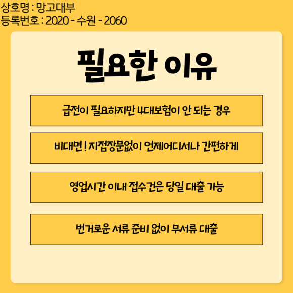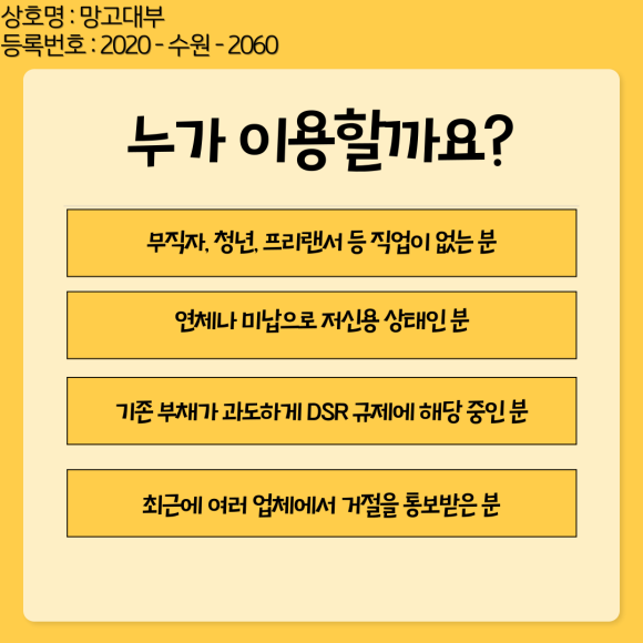 이는 직업이 마땅히 없는 분에게도 자금을 대여해주는 금융 상품입니다. 우리가 흔히 1금융권이라고 부르는 일반 시중은행의 경우 직업이 없는 사람들에게 금액을 대여하는 것에 굉장히 까다롭기 때문에 이용하기 어렵습니다. 2금융권인 저축은행 역시 상당히 까다로운 요건을 요구하고 있기에, 실질적으로 3금융권인 대부업체를 통해 돈을 빌릴 수밖에 없는 실정입니다. 굉장히 급한 상황이라면 유용하게 활용할 수 있겠으나, 불법 사금융의 피해자가 될 수 있기 때문에 여러모로 신중히 고려하고 결정해야 하는 문제입니다. 금융감독원에서도 피해자가 급증하고 있는 점에서 우려하고 있을 정도이므로 이용하실 때 주의해야 합니다.