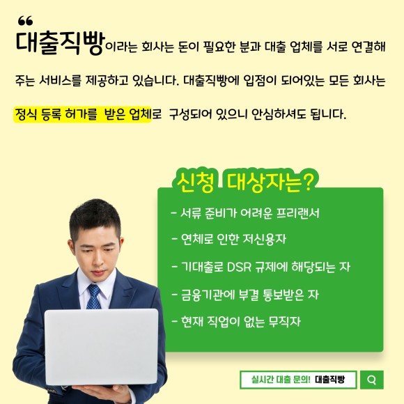 일반적으로 돈이 필요하다고 하는 분들은 은행을 통해 필요한 자금을 빌려보려고 하지만 4대보험 가입과 고정 수입을 가지고 있는 직장인에 한해서 조건에 해당될 수 있었고 기존 부채가 많으면 DSR규제로 한도 나오지 못하기도 하였기에 원하는 계획에 맞게 나아갈 수 없습니다.