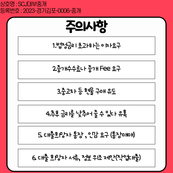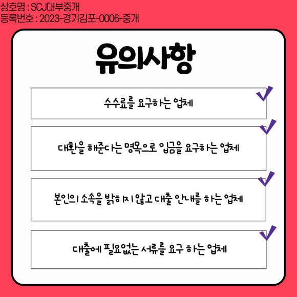 물론 대부업체를 통해 돈을 빌리실 때는 주의해야 할 몇 가지 사항이 있습니다. 특히 불법사금융으로 인한 피해자가 속출하고 있어 정상업체와 불법업체를 잘 가려낼 수 있어야 합니다. 불법업체를 선별하기 위해선 크게 네 가지 요소로 판단할 수 있습니다. 첫째, 수수료를 요구하는 곳입니다. 보통 우리는 급전이 필요로 하기 때문에 앞뒤 사정 가리지 않고 받아보게 되는데요. 하지만 법적으로 수수료뿐 아니라 알선료, 중개료 등은 금지되어 있기 때문에 이러한 것들을 요구하는 곳이 있다면 불법일 가능성이 높으니 반드시 피하시길 바랍니다.