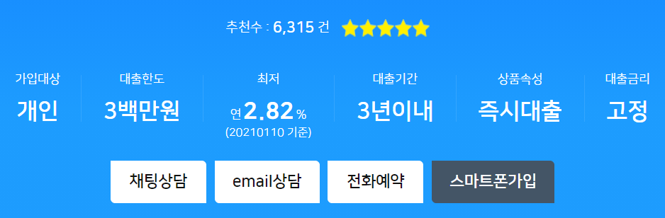 그리고 요즘에 출시되는 소액대출 상품은 대부분 모바일로 신청할 수 있는 비대면, 무방문 대출인 경우가 많습니다.
