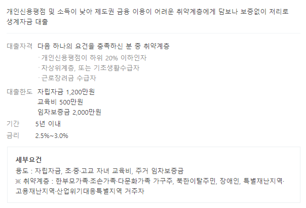 신용도가 낮고, 소득이 낮은 서민들을 위한 정부지원대출이다보니 대출금리가 금융권 대출보다 저렴한 편 입니다.