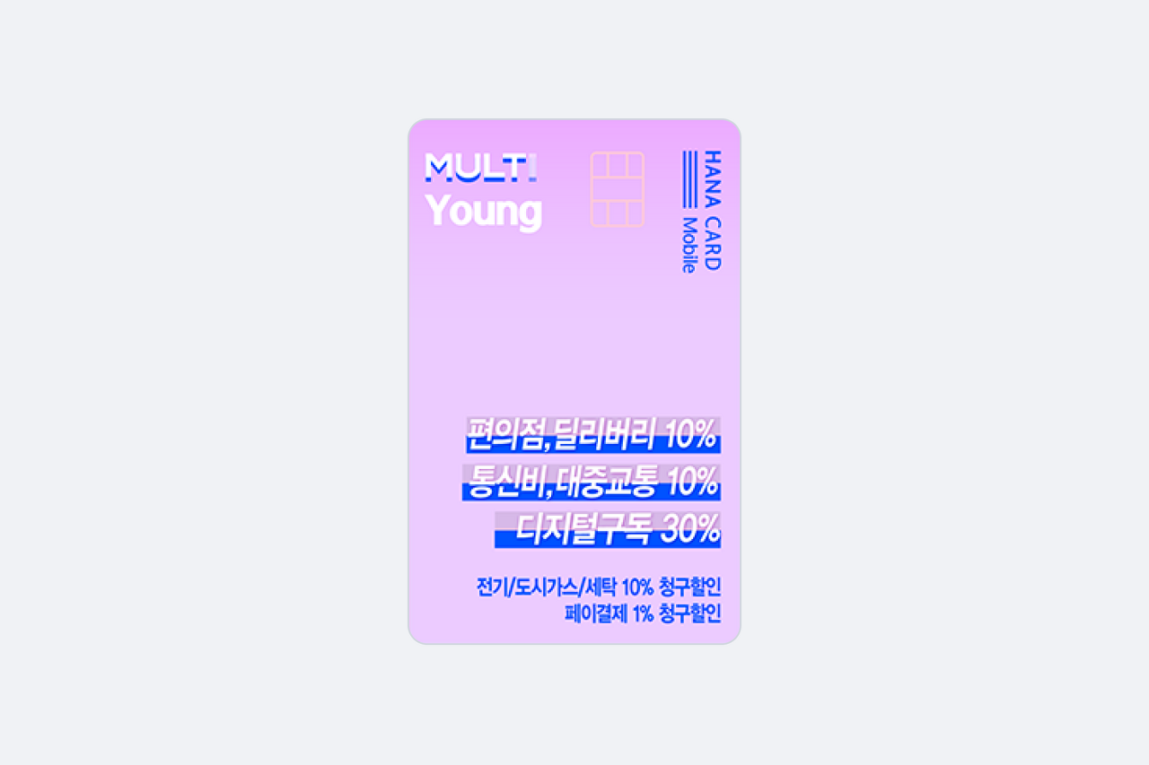 멀티영 카드는 간편결제, 배달, 디지털 구독 할인과 편의점, 대중교통, 통신, 생활비 등 일상생활에서 자주 이용하는 영역에서 혜택이 제공되는 카드로 이름처럼 Young 한 사람들을 위한 멀티형 카드입니다. 자취하는 대학생의 첫 신용카드로 추천합니다.