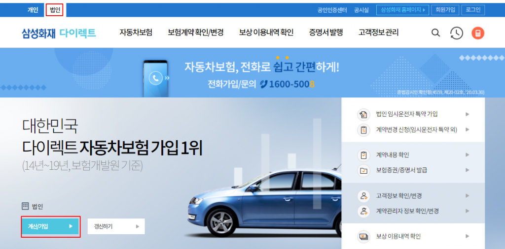 먼저 삼성화재 다이렉트 홈페이지에 접속을 하신 후 좌측 상단에 있는 개인과 법인 중 법인메뉴를 선택해 주시기 바랍니다.