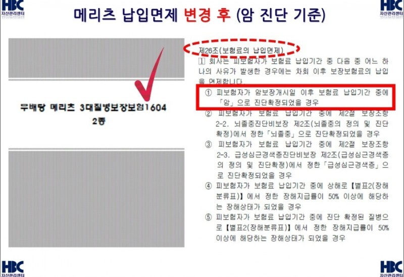 2016년 4월에 개정된 약관의 보험료 납입면제 요건은 「피보험자가 암보장개시일 이후 보험료 납입기간 중에 암으로 진단확정 되었을 경우」 로 '암보장개시일 이후'라는 문구가 추가되었습니다.
