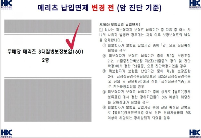 2016년 1월에 나온 약관의 보험료 납입면제 요건은 「피보험자가 보험료 납입기간 중에 암으로 진단확정 되었을 경우」 였으나