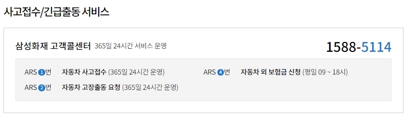 3. 삼성화재 자동차보험 사고접수 및 긴급출동 서비스 관련 콜센터 전화번호는 1588-5114 입니다.