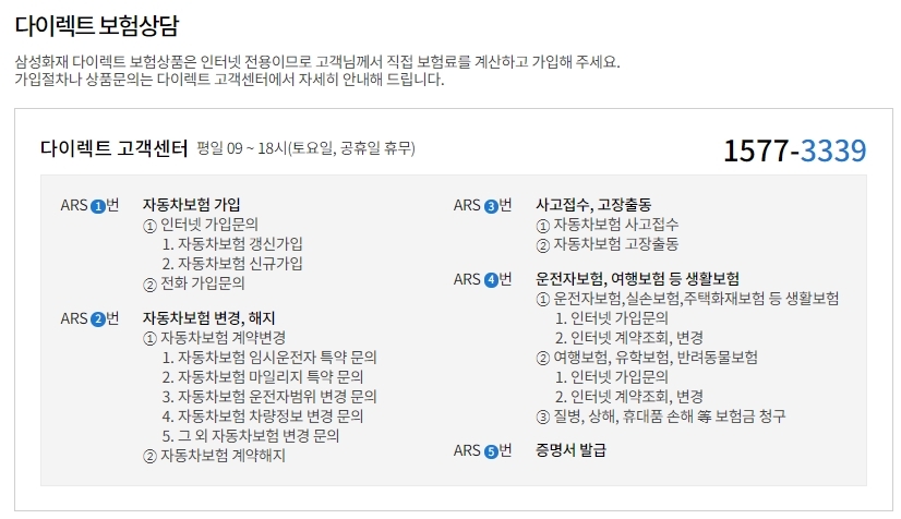 삼성화재 다이렉트 자동차보험에 가입, 변경, 해지, 사고접수 및 고장출동, 운전자보험, 여행보험, 생활보험, 증명서 발급 등의 업무를 보시려는 분들은 1577-3399로 전화하시면 삼성화재 콜센터로 바로 연결됩니다.