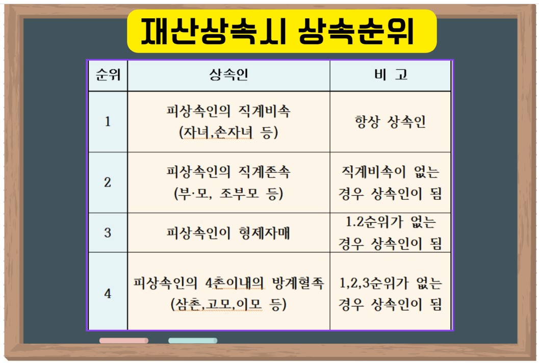 상속인이란 상속재산을 물려받는 사람을 지칭하며 상속은 1순위 피상속인의 직계비속.. 배우자 2순위 피상속인의 직계존속, 배우자 3순위로 피상속인의 형제자매, 4순위로 피상속인의 4촌 이내의 방계혈족의 순서로 상속받습니다