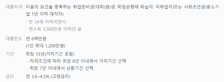 - 연소득 3,500만원 이하인 취업준비생(대학생, 대학원생, 학점은행제 수강자, 미취업청년) 또는 사회초년생(중소기업 재직기간 1년 이하인 자)