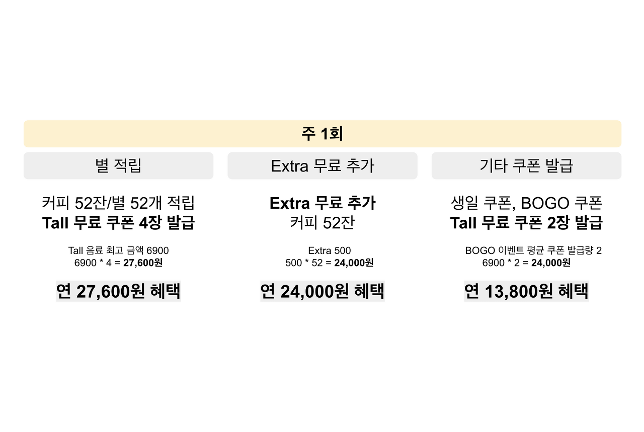 스카벅스카드 이용시 별 12개에 Tall 무료 쿠폰 1장이 발급되는거 기억하시죠? 스타벅스카드를 주 1회 이용시 연간 Tall 사이즈 음료 무료 쿠폰 4장이 제공됩니다. 최대 구매가인 6,900원을 12번 정도 무료로 제공받을 수 있으니 연간 혜택을 받을 수 있는 총 금액은 27,600원 입니다.