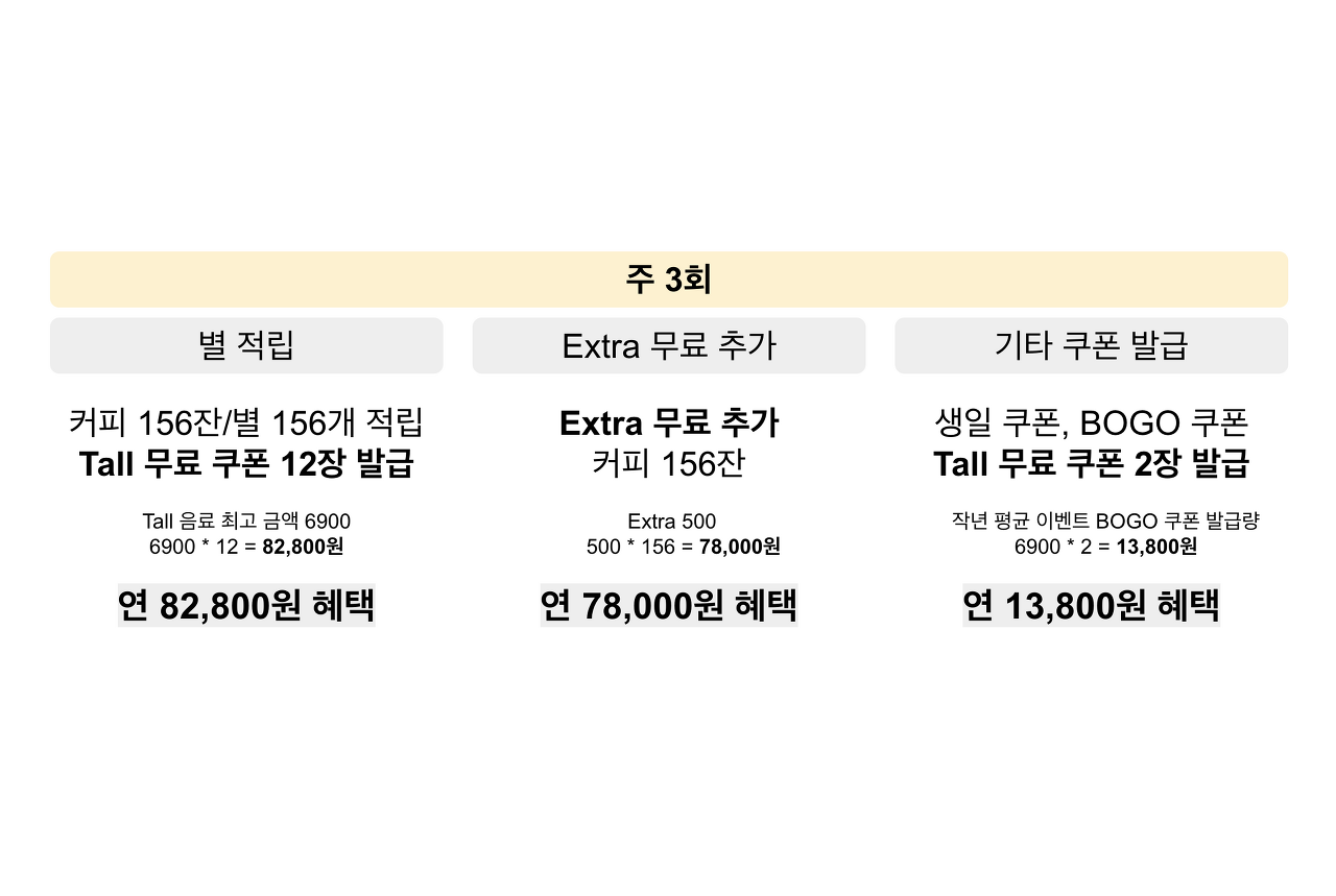 스타벅스를 주 3회정도 이용시에는 1년에 156잔의 커피를 마시게 됩니다. 그럼 156개의 별이 적립되겠죠.
