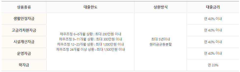 대출은 운영자금, 시설자금, 생계자금, 저금리 전환자금(대환대출), 학자금 용도로 이용하실 수 있습니다.