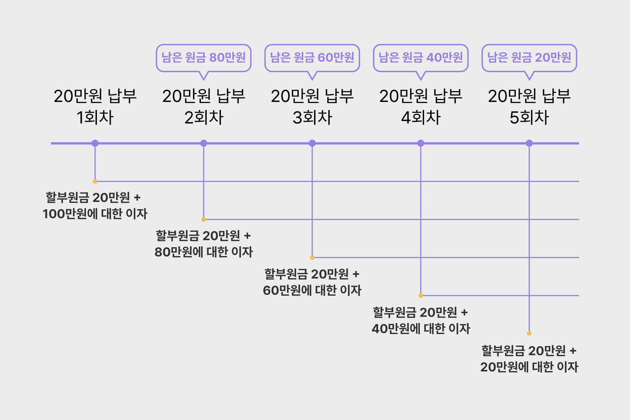 예를 들어 100만 원 짜리 물건을 5개월 할부로 구매했다면 다음과 같다.
