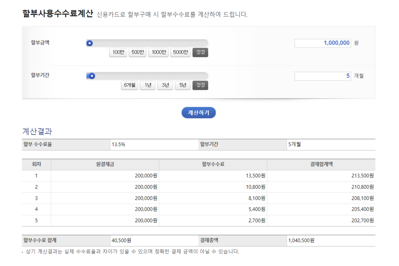 이 방법이 어렵다면, 직접 자신이 사용하는 신용카드사의 할부이자계산기를 사용하는 것도 괜찮다.
