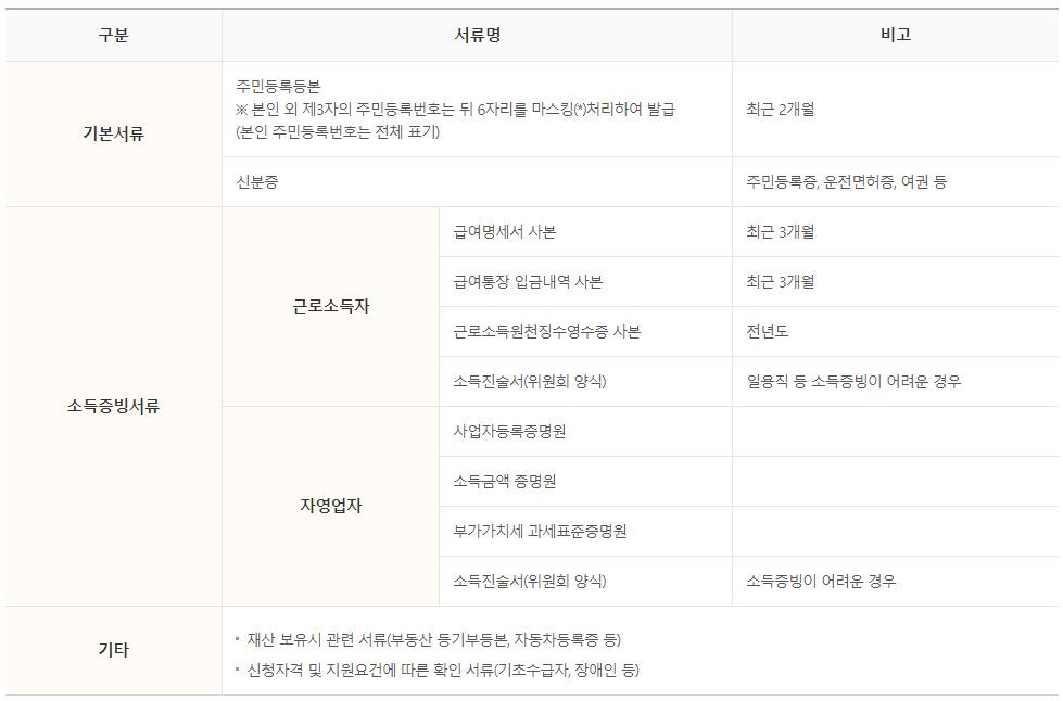 그리고 소득증빙서류가 필요합니다. 이는 근로소득자와 자영업자에 따라 준비해야 하는 서류가 다릅니다.