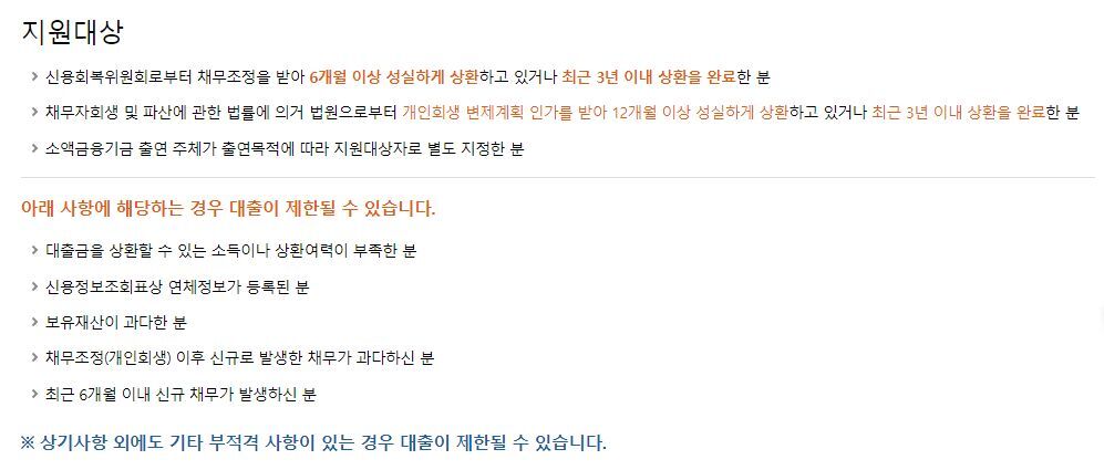 2. 신용회복위원회 성실상환자 소액대출 총정리(지원 자격조건, 대출한도 및 금리 등)