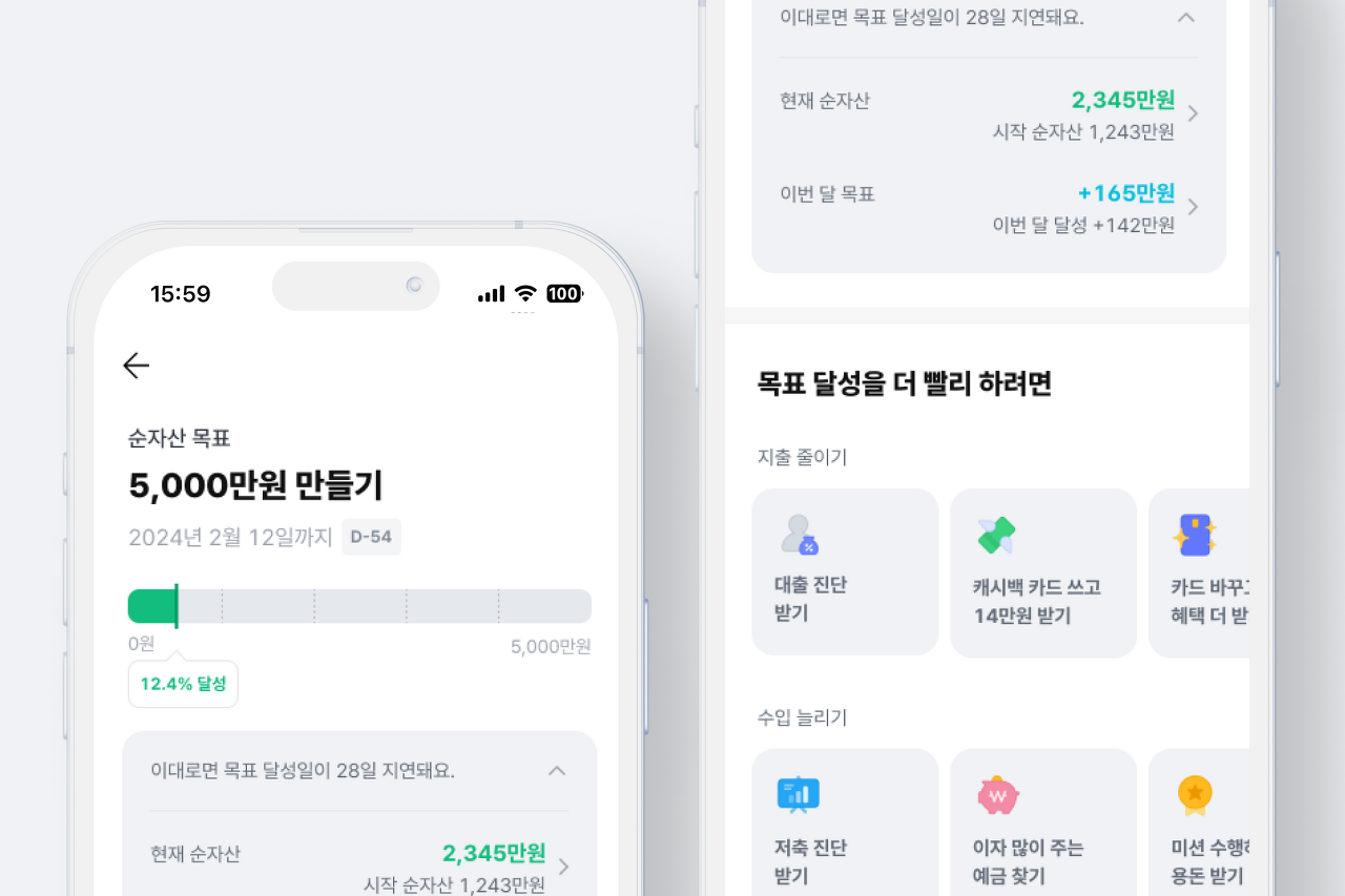 뱅크샐러드 목표 보드는 '목표 순자산과 기간'을 입력하면 월 저축금액을 제안해주더라고요. 이 기능을 활용하여 목표를 설정해봐도 좋을 것 같고요. 목표 순자산을 향한 현재의 달성률 및 더 빠른 달성을 위한 조언도 확인할 수 있으니, 한번 활용해보시는 것도 좋을 것 같아요.