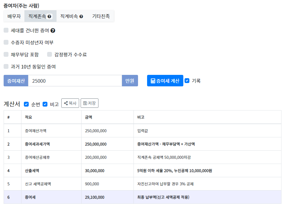증여세 계산기에 증여자를 직계존속으로 설정하고 증여할 재산을 2억 5천만원으로 설정한 후 계산하기 버튼을 눌러주시기 바랍니다.