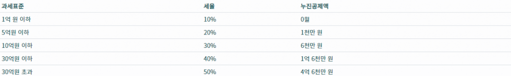 - 30억원 이하(과세표준) – 40%(증여세율), 1억 6천만원(누진공제액)