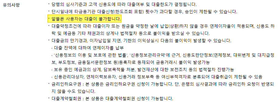 실제로 우리은행 우리 비상금대출 상품설명을 보더라도 알뜰폰 이용자는 해당 비상금대출을 이용할 수 없다고 나와있습니다.