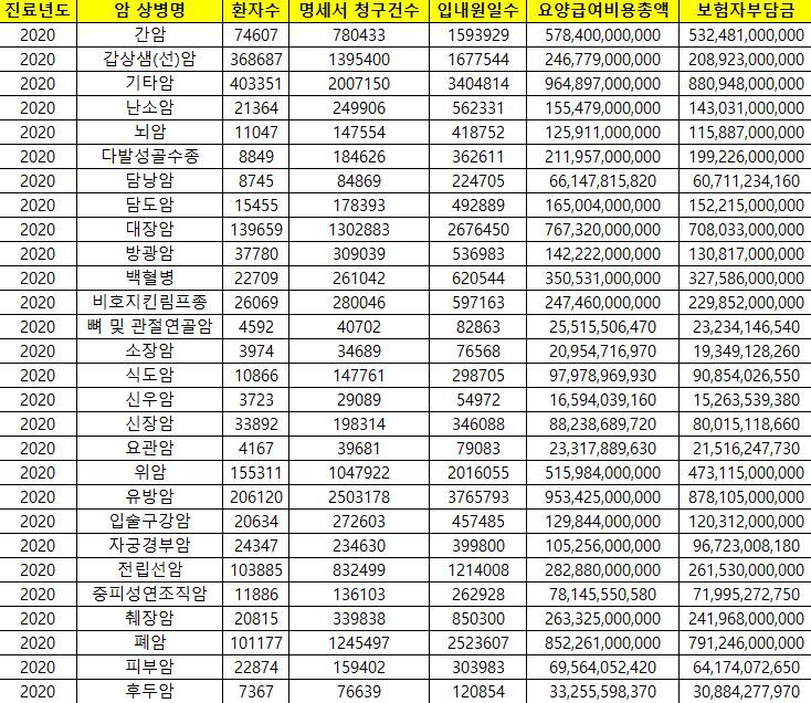 암 종류 직접비용 간접비용 계 직접의료비 직접비의료비 이환손실액 사망손실액 보호자시간비용 위암 3,633 2,278 7,215 13,522 208 26,856 폐암 7,421 2,981 5,425 30,446 300 46,573 간암 6,576 2,781 8,845 47,756 269 66,227 대장암 4,767 2,482 6,417 9,572 282 23,520 유방암 3,181 2,169 3,730 5,154 451 17,685 자궁경부암 2,697 2,129 5,877 5,162 261 16,126 갑상선암 1,254 1,779 7,483 517 230 11,263 담낭암 6,246 2,919 4,901 28,259 215 42,540 췌장암 7,449 3,189 5,933 46,880 266 63,717 방광암 2,874 2,133 5,716 3,738 180 14,641 전립선암 2,968 3,039 3,064 2,020 169 10,260 신장암 3,131 2,079 8,397 9,822 216 23,645 식도암 7,326 3,059 5,903 26,651 323 43,262 난소암 6,201 2,594 6,288 10,908 273 26,264 백혈병 18,760 2,910 6,681 38,373 279 67,003 구강암 4,120 2,443 7,624 12,726 426 27,339 후두암 3,282 2,277 3,096 10,193 297 22,145 피부 흑색종 4,599 2,653 6,808 24,848 348 39,256 뇌 및 중추신경계암 6,996 2,722 7,649 35,285 296 52,948 비호지킨림프종 7,992 2,605 7,935 20,656 331 39,519 호지킨병 5,090 2,234 9,322 11,149 386 28,181 다발성 골수암 12,154 3,449 6,651 24,465 443 47,162 고환암 2,619 1,799 10,473 6,022 229 21,142 자궁체부암 2,696 2,128 6,174 3,653 296 14,947 비인두암 5,384 2,615 10,558 17,821 560 36,938 기타 인두암 6,578 2,913 7,851 16,798 490 34,630 기타암 5,519 2,539 6,469 18,364 287 33,178 전체 4,650 2,397 6,780 15,641 280 29,748 암 치료비용 통계적으로 얼마나 들어가는지 알아보자