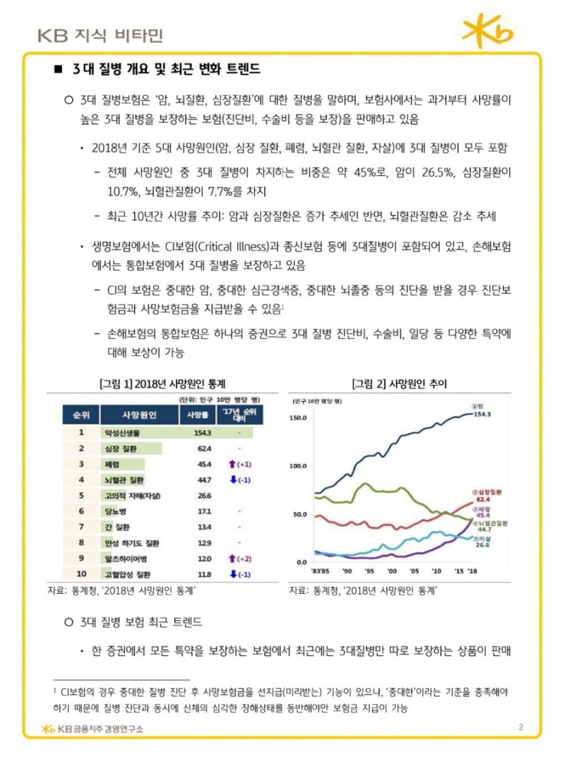 □ ‘3대 질병보험’은 ‘암, 뇌질환, 심장질환’에 대한 질병을 말하며, 보험사에서는 과거부터 사망률이 높은 3대 질병을 보장하는 보험(진단비, 수술비 등을 보장)을 판매하고 있음