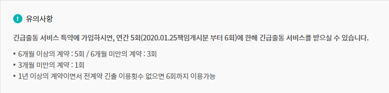 만약 6개월 이상일 경우에는 5회, 6개월 미만일 경우에는 3회, 3개월 미만일 경우에는 1회만 출동 서비스를 제공합니다.
