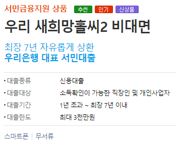 우리은행의 대표 서민대출인 새희망홀씨2 비대면 대출은 최대 3천만원까지 대출이 가능한 상품입니다.