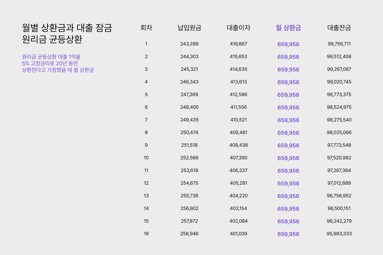 다음 표의 원리금 균등상환 계산기를 통해 회차별 원금과 이자를 살펴보면 이해가 수월하다.
