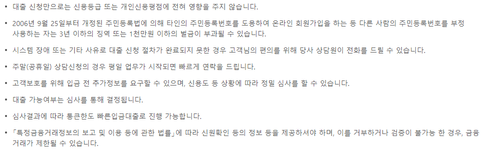 - 대출신청을 한다고 신용등급이나 개인신용평점에 영향을 주지 않습니다.