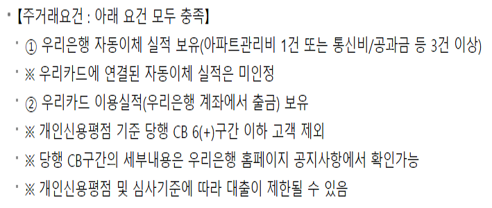 대출조건은 신용카드를 1년 이상 보유하고 있고, 주거래 요건을 충족하시는 분 입니다.