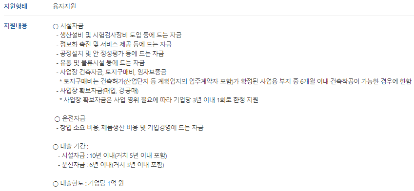 해당 대출상품은 시설자금, 운전자금을 지원 받을 수 있는 상품으로 기업당 최대 1억원까지 대출이 가능합니다.